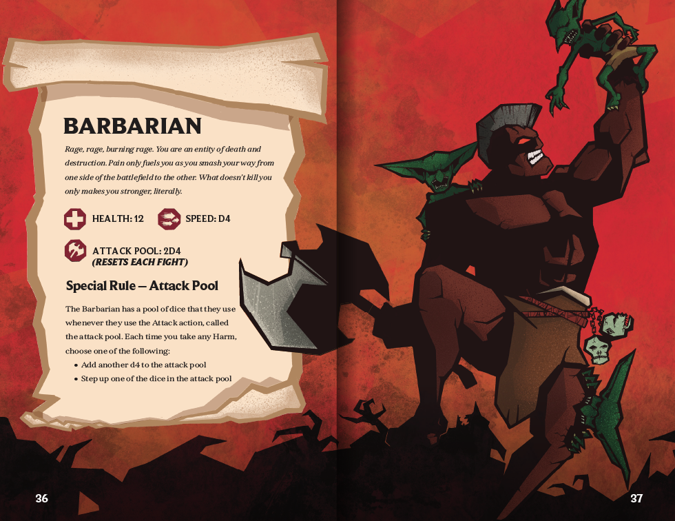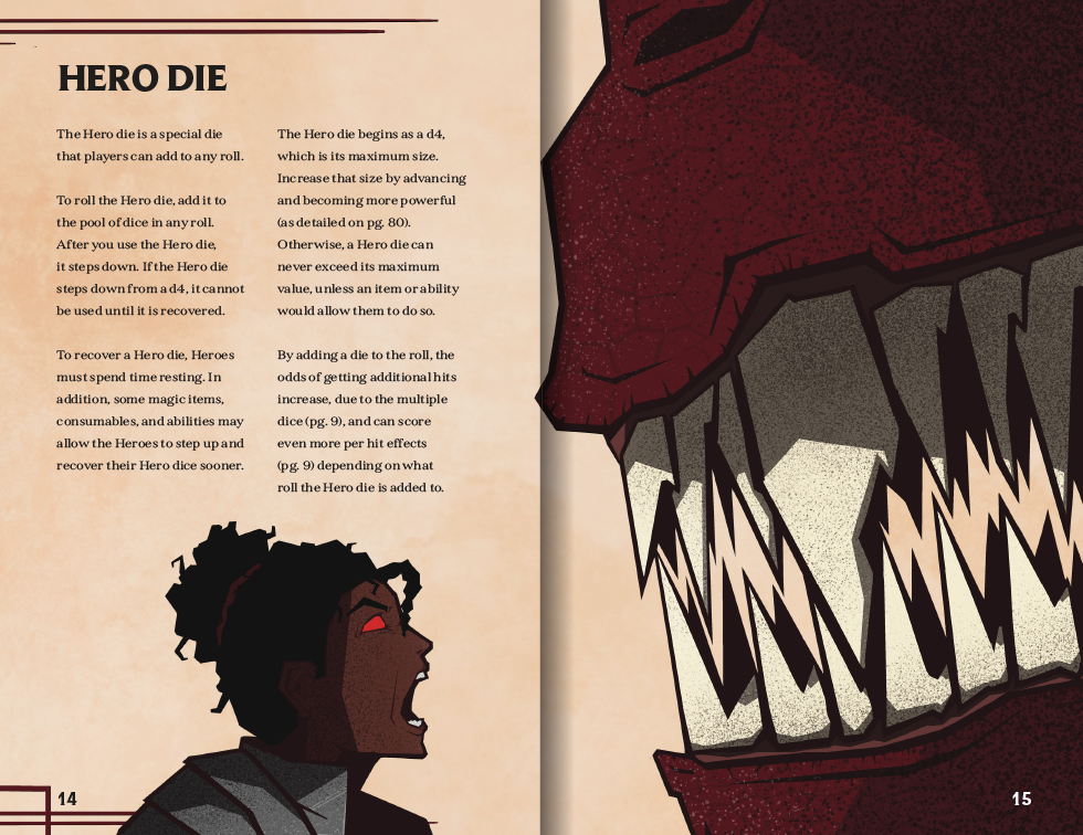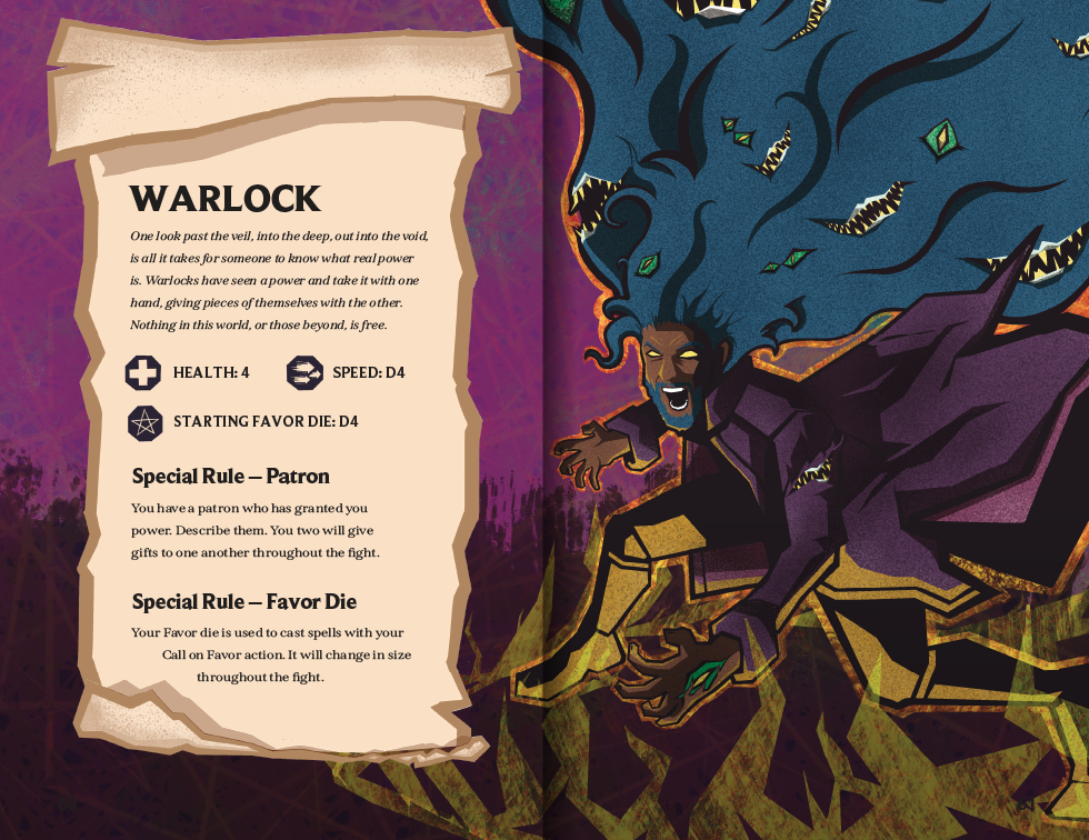 Dragon Slayers uses a simple 4+ system to create an action filled session that moves quickly. What sets Dragon Slayers apart from other RPGs is its emphasis on asymmetrical combat. Each class in the game uses completely different combat mechanics than the others, allowing the players to have an entirely unique experience at the table.
