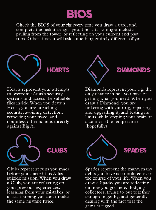Rigged is a solo journaling RPG, made using the Wretched & Alone rules by Chris Bissette and Matt Sanders. You play as a hacker who is up against the ropes, desperate to get out of a debt that threatens to swallow you whole if you don’t pull off a miracle. That miracle is extracting some files from the largest and most dangerous megacorp out there: Atlas.