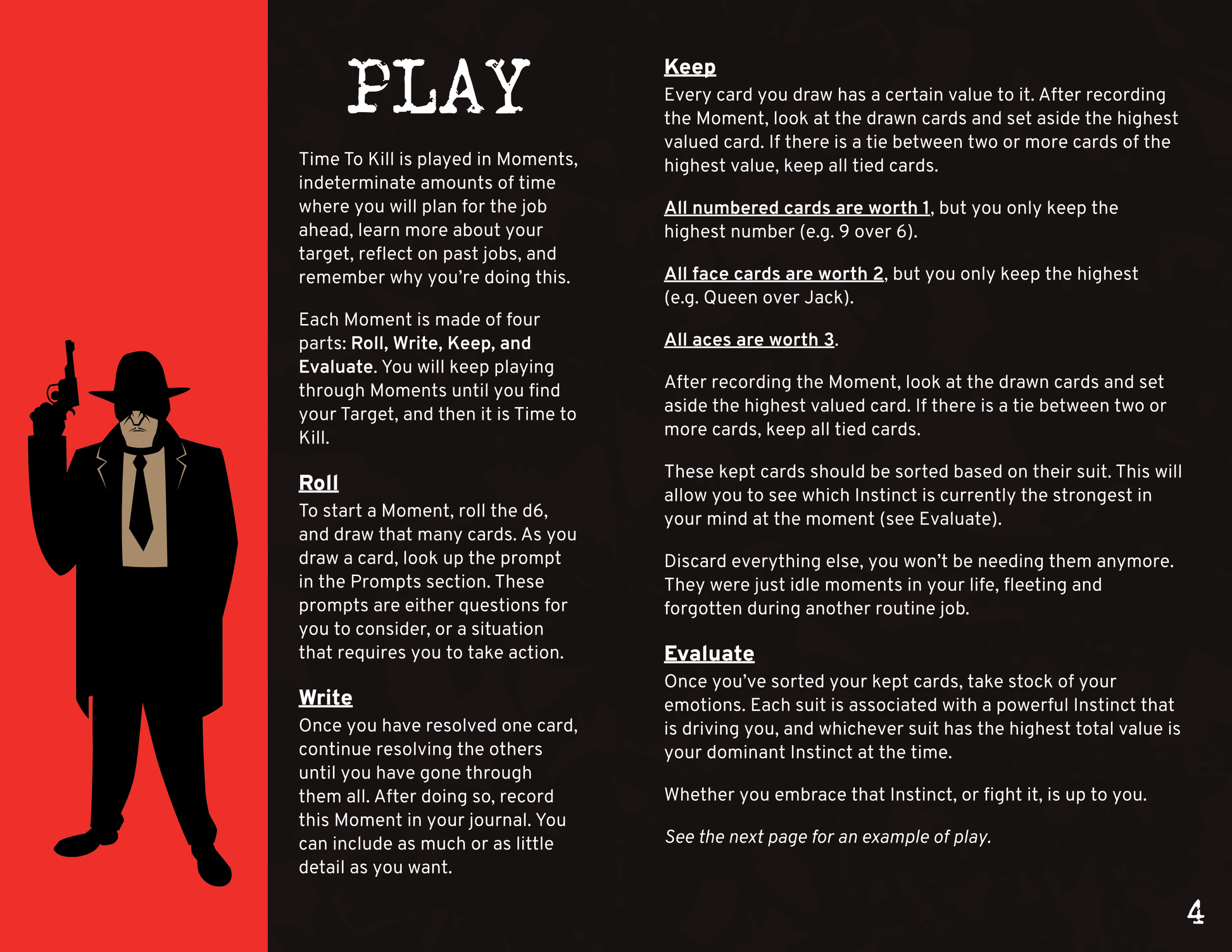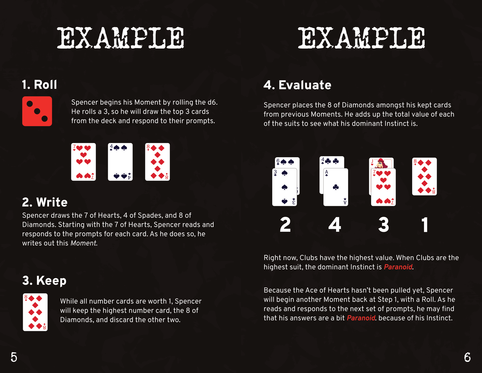 Play in Time To Kill revolves around rolling a d6, drawing cards, and responding to prompts based on those cards. As you draw more cards, and record your thoughts, your emotions and instincts will shift.